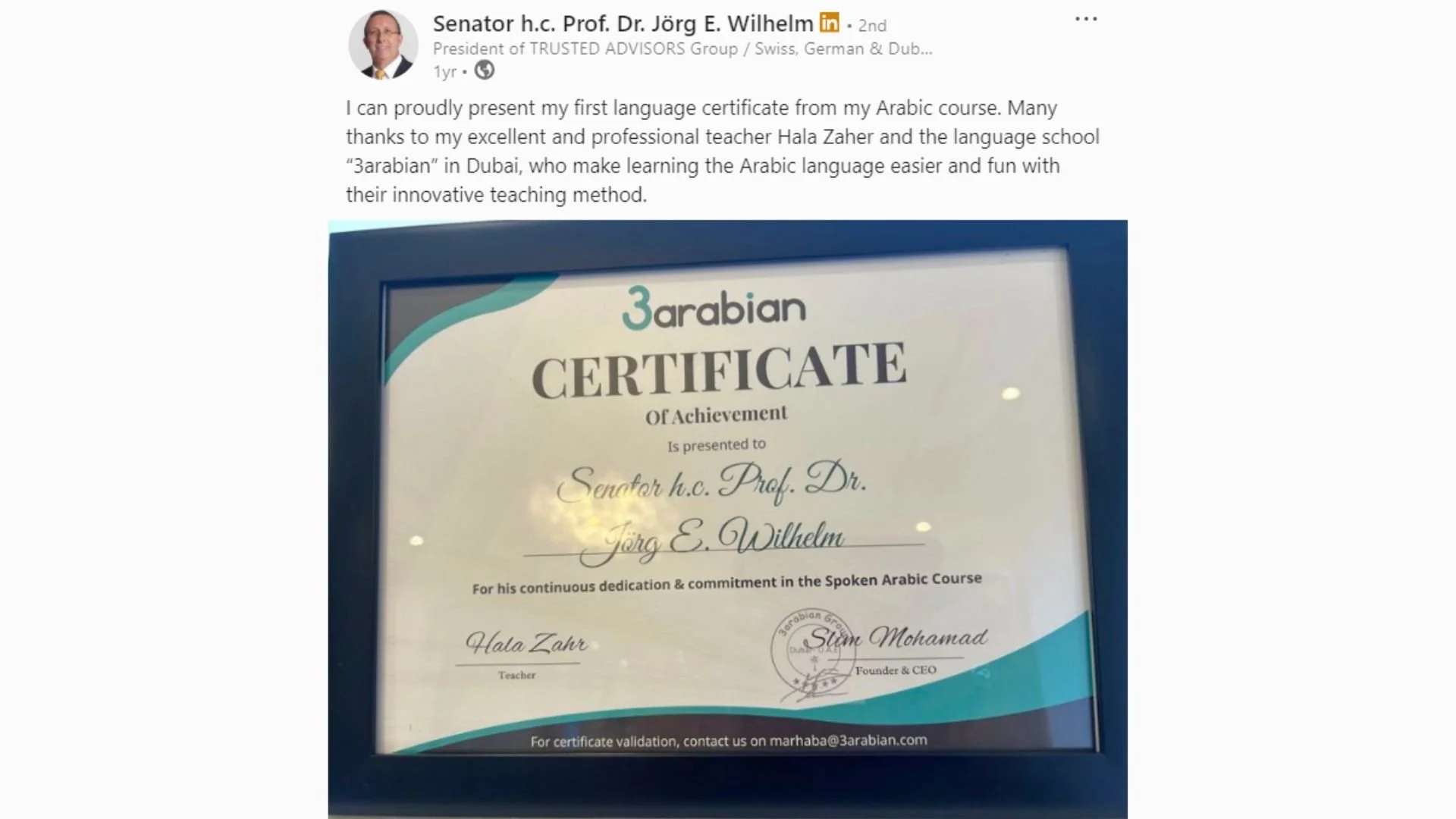 “We have been with 3arabian for the past 6 months taking corporate group classes and 1:1 individual classes. The progress of our team is significant and our Arabic communication is advancing. We highly recommend 3arabian. Arabic has never been that simple and fun to learn!”